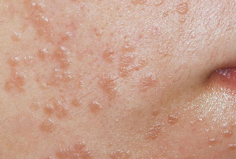 易发生在面部、手背、小臂等。皮疹的特征是皮肤颜色,呈浅红或浅棕色,大小至绿豆大小,呈圆形或多角形,表面平滑,边界清晰。皮疹数量多,通常是分散的或稠密的,这是因为搔痒引起的自体免疫反应——皮疹沿着抓痕形成了一串珍珠。