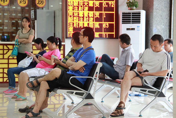 今天早上八点,已经有十来位提前预约的患者迫不及待地到院看诊了。导医台、化验室、医生诊室、输液室、治疗室各个部门开始有条不紊地运行起来,院内穿着白大褂的导诊护士往来穿梭指引患者到不同流程环节进行就诊。与此同时更多地患者陆续到院,医院一楼候诊区的三十多个座椅早已坐满,很多患者干脆直接到医生诊室外面排起队列,医院一楼、二楼、三楼走廊里都是等候就诊的患者。